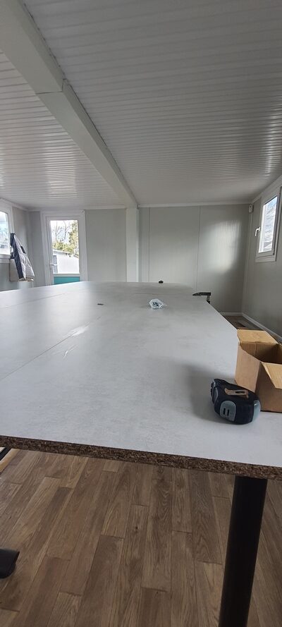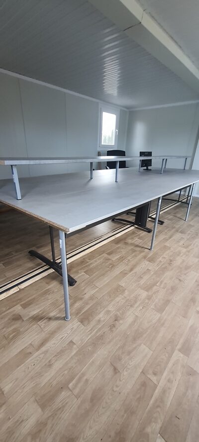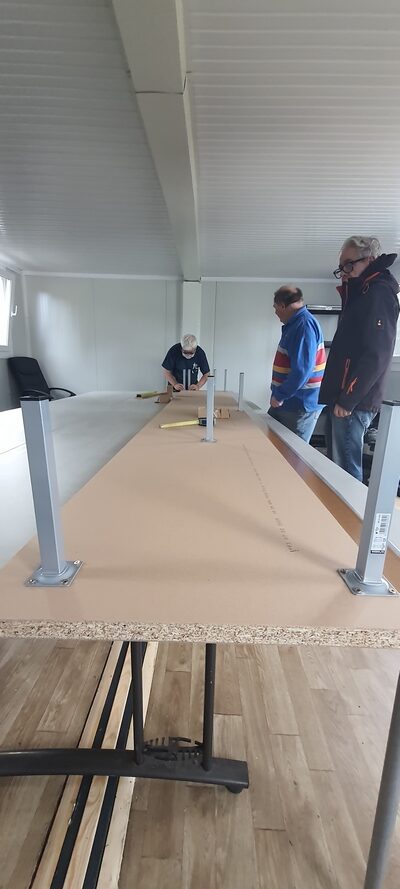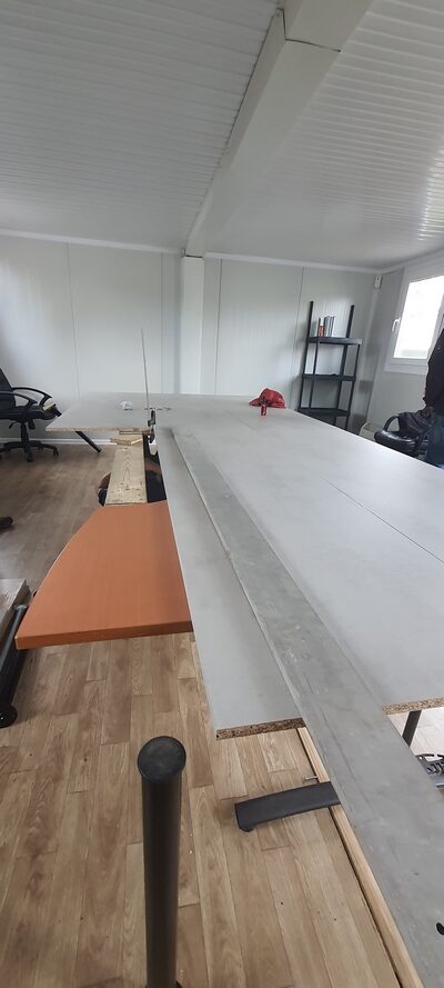 La première grande étape a consisté à construire le mobilier destiné à recevoir les équipements. Et le travail n’a pas été mince ! Pas moins de huit plans de travail ont dû être assemblés, accompagnés d’une quinzaine de piétements, afin de créer des postes solides, fonctionnels et adaptés aux besoins du club.