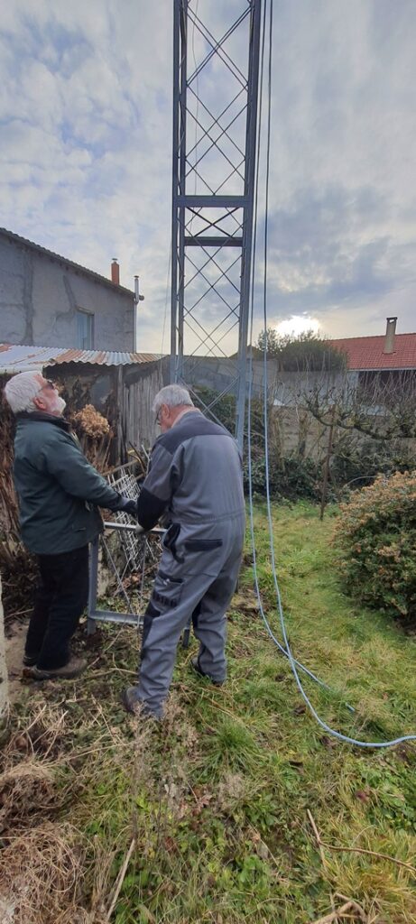 Lundi 19, une belle équipe (F1MNQ, F4EHA, F4GCZ, F8ATS, F1PUX, F5LRL) s’est retrouvée pour une mission importante : démonter et récupérer un pylône de 12 mètres destiné au radio-club F6KJS. Direction la région Roannaise (42), au QRA de F1MDH (SK), où nous avons été accueillis très chaleureusement par son fils, Dominique, que nous remercions sincèrement pour sa gentillesse et sa disponibilité.